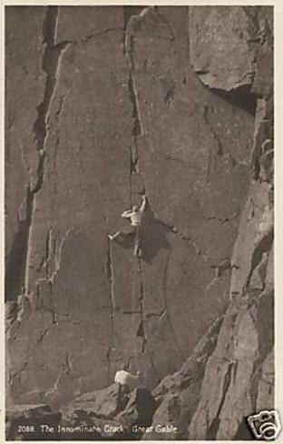 First, Wilfred achieved an unprecedented ascent of the notorious, 80-foot Innominate crack in boots. This is a narrow cleft in a truly vertical, smooth face, normally only ever attempted in rubbers(i. e. tennis shoes). I followed him up, but even in rubbers found it so fiendishly difficult that I could well understand why an appropriate name had never been thought of for it.